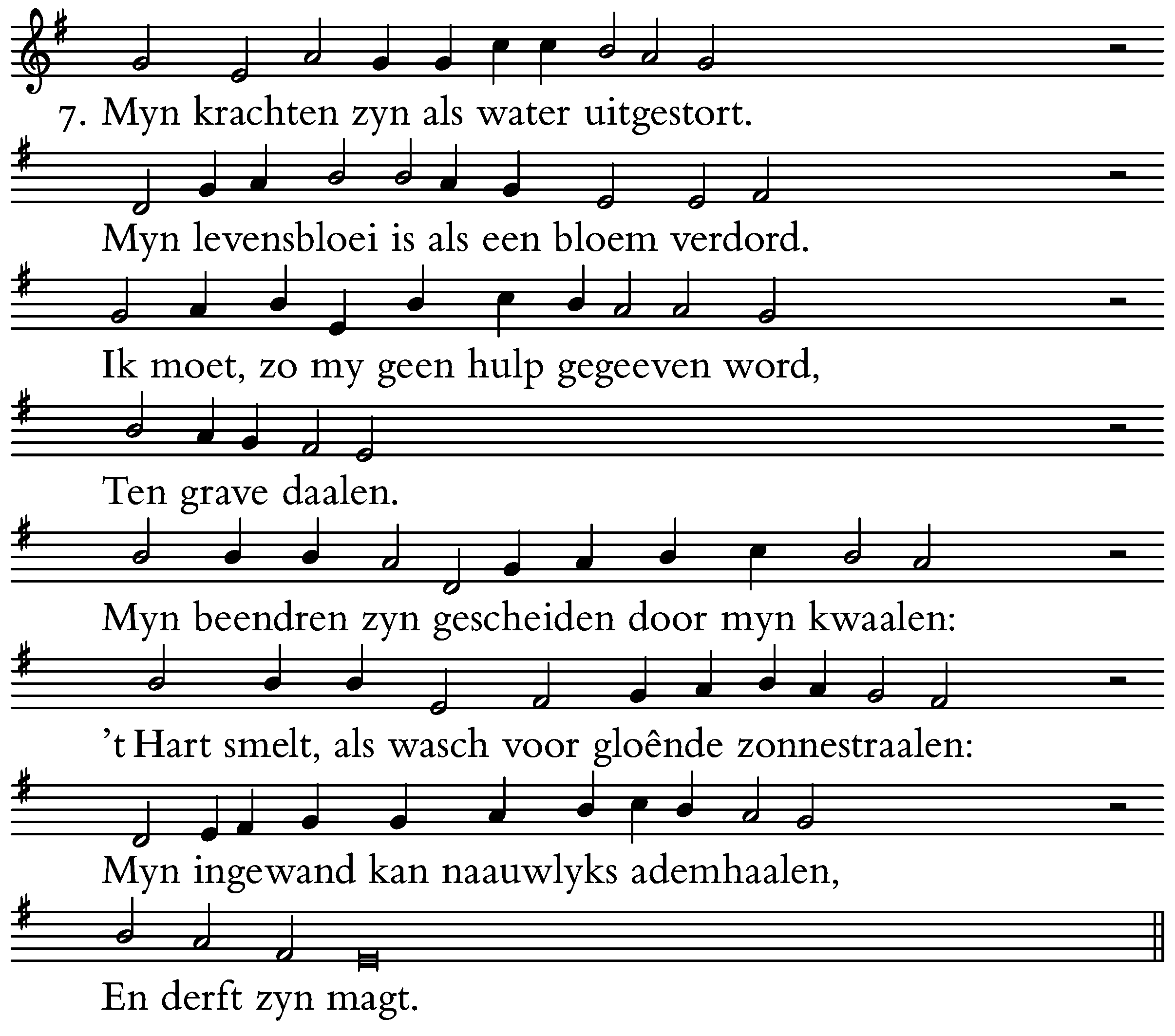 Myn krachten zyn als water uitgestort.