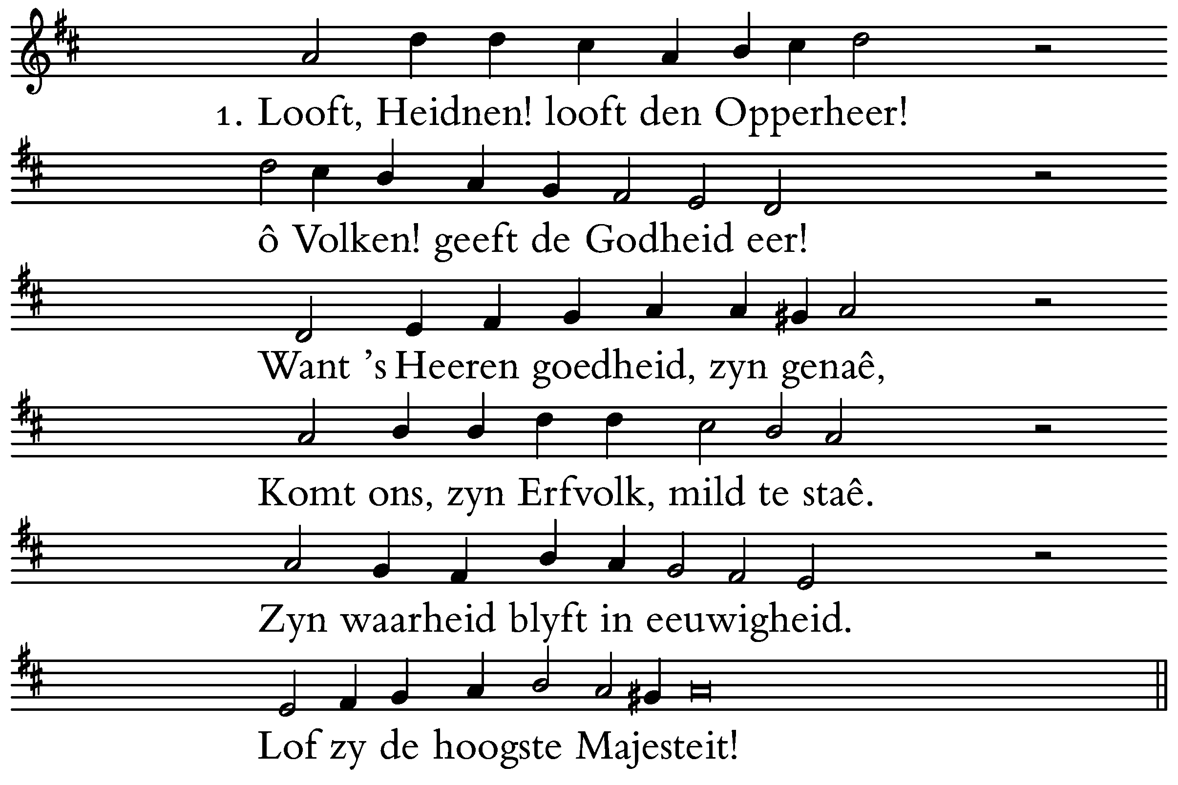 1. Looft, Heidnen! looft den Opperheer! ô Volken! geeft de Godheid eer! Want ’s Heeren goedheid, zyn genaê, Komt ons, zyn Erfvolk, mild te staê. Zyn waarheid blyft in eeuwigheid. Lof zy de hoogste Majesteit!